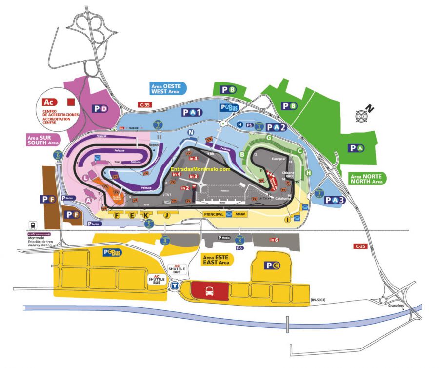 Die Parkplätze der Rennstrecke in Montmelo öffnen am Freitag und Samstag um 7:00 Uhr und am Sonntag um 6:00 Uhr. Die Parkplätze schliessen nachts; es ist nicht erlaubt Fahrzeuge über Nacht abgestellt/geparkt zu lassen. Die Parkplätze sind nicht asphaltiert.